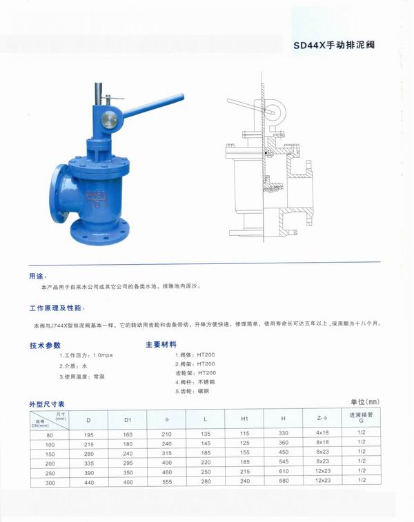 SD44X手動(dòng)排泥閥:本排泥閥用于自來水公司或其他公司的各類水池,排除池內(nèi)泥沙。