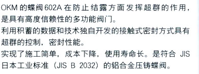 日本OKM閥門:602A蝶閥采用獨(dú)自開發(fā)的接觸密封方式,大幅度降低操作力矩,可用于各種流體的通用閥門,防結(jié)露鋁合金壓鑄蝶閥。高使用壓力:1.0MPa、 適用法蘭:JIS 5K、10K、 用途:建筑設(shè)備 一般工業(yè)用