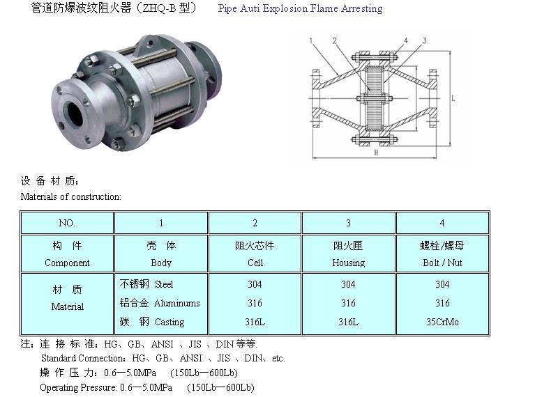 阻火器能夠阻止火焰繼續(xù)傳播并迫使火焰熄滅的因素之一是傳熱作用。我們知道,阻火器是由許多細小通道或孔隙組成的,當火焰進入這些細小通道后就形成許多細小的火焰流。由于通道或孔隙的傳熱面積很大,火焰通過通道壁進行熱交換后,溫度下降,到一定程度時火焰即被熄滅。進行的試驗表明,當把阻火器材料的導熱性提高460倍時,其熄滅直徑僅改變2.6%。這說明材質問題是次要的。即傳熱作用是熄滅火焰的一種原因,但不是主要的原因。因此,對于作為阻爆用阻火器來說,其材質的選擇不是太重要的。但是在選用材質時應考慮其機械強度和耐腐蝕等性能。
